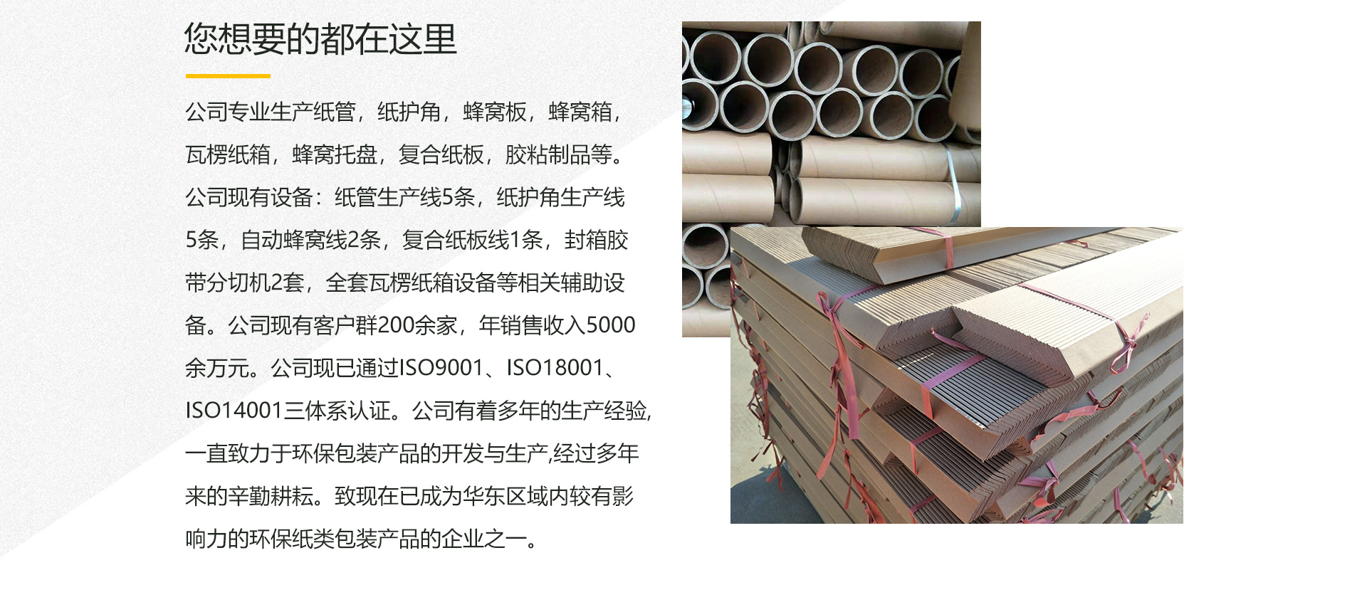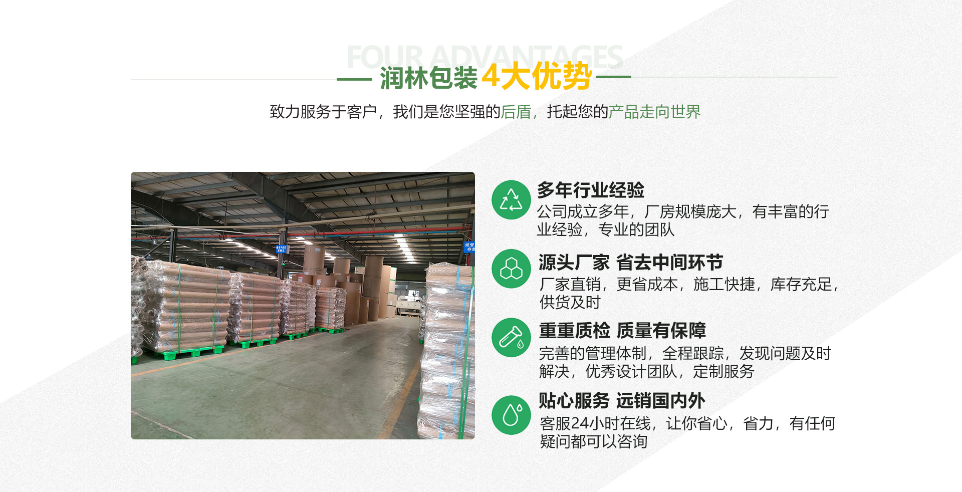 蕪湖潤(rùn)林包裝材料有限公司成立于2003年,注冊(cè)資本3700萬(wàn)元。公司占地22000余平方米,廠房面積16000余平方米。公司主要生產(chǎn)紙管,紙護(hù)角,蜂窩板,蜂窩箱,瓦楞紙箱,蜂窩托盤(pán),復(fù)合紙板,膠粘制品等。公司現(xiàn)有設(shè)備:紙管生產(chǎn)線5條,紙護(hù)角生產(chǎn)線5條,自動(dòng)蜂窩線2條,復(fù)合紙板線1條,封箱膠帶分切機(jī)2套,全套瓦楞紙箱設(shè)備等相關(guān)輔助設(shè)備。公司現(xiàn)有客戶(hù)群200余家,年銷(xiāo)售收入5000余萬(wàn)元。公司現(xiàn)已通過(guò)ISO9001、ISO18001、ISO14001三體系認(rèn)證。公司有著多年的生產(chǎn)經(jīng)驗(yàn),一直致力于環(huán)保包裝產(chǎn)品的開(kāi)發(fā)與生產(chǎn),經(jīng)過(guò)多年來(lái)的辛勤耕耘。致現(xiàn)在已成為華東區(qū)域內(nèi)較有影響力的環(huán)保紙類(lèi)包裝產(chǎn)品的企業(yè)之一。公司的產(chǎn)品以外型美觀/工藝精良/服務(wù)贏得了客戶(hù)的認(rèn)可,在包裝行業(yè)中擁有良好的口碑,卓1越的技術(shù)是產(chǎn)品質(zhì)量的保證,完善的服務(wù)是我們共同發(fā)展的基礎(chǔ),我們?cè)敢詢(xún)?yōu)良的技術(shù)/優(yōu)l質(zhì)的產(chǎn)品/實(shí)惠的價(jià)格/完善的服務(wù)與您共創(chuàng)雙贏的未來(lái)。本公司一直秉承以誠(chéng)待人,以客為本經(jīng)營(yíng)...